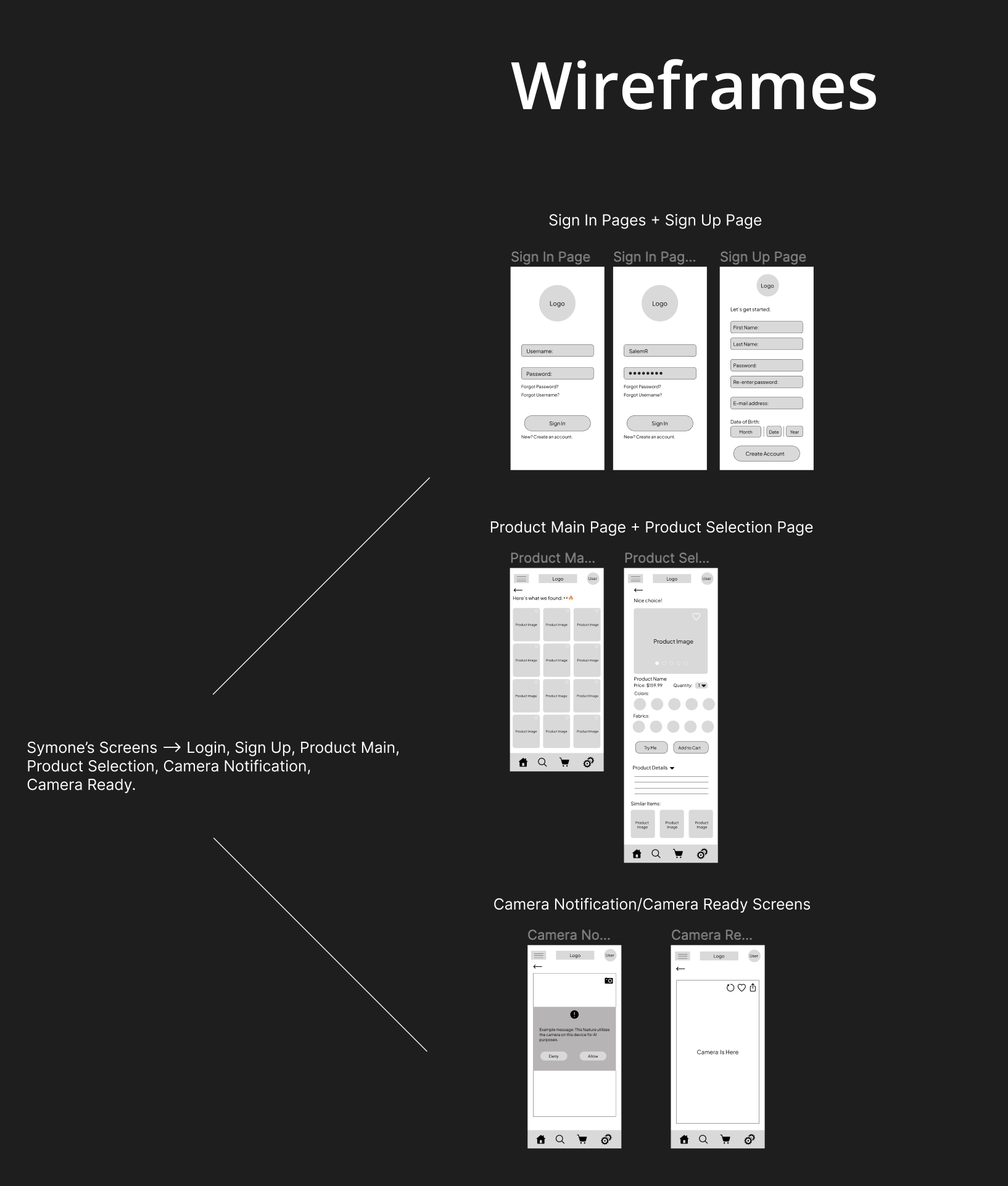 My Role: I worked as a User Researcher and Product Designer on a 4 person team. Here, I created the logo design, assisted with the user research survey, worked on sketches and wireframes (for the log-in, fit/style page, and the product selection pages) as well as assisted with the UX writing.