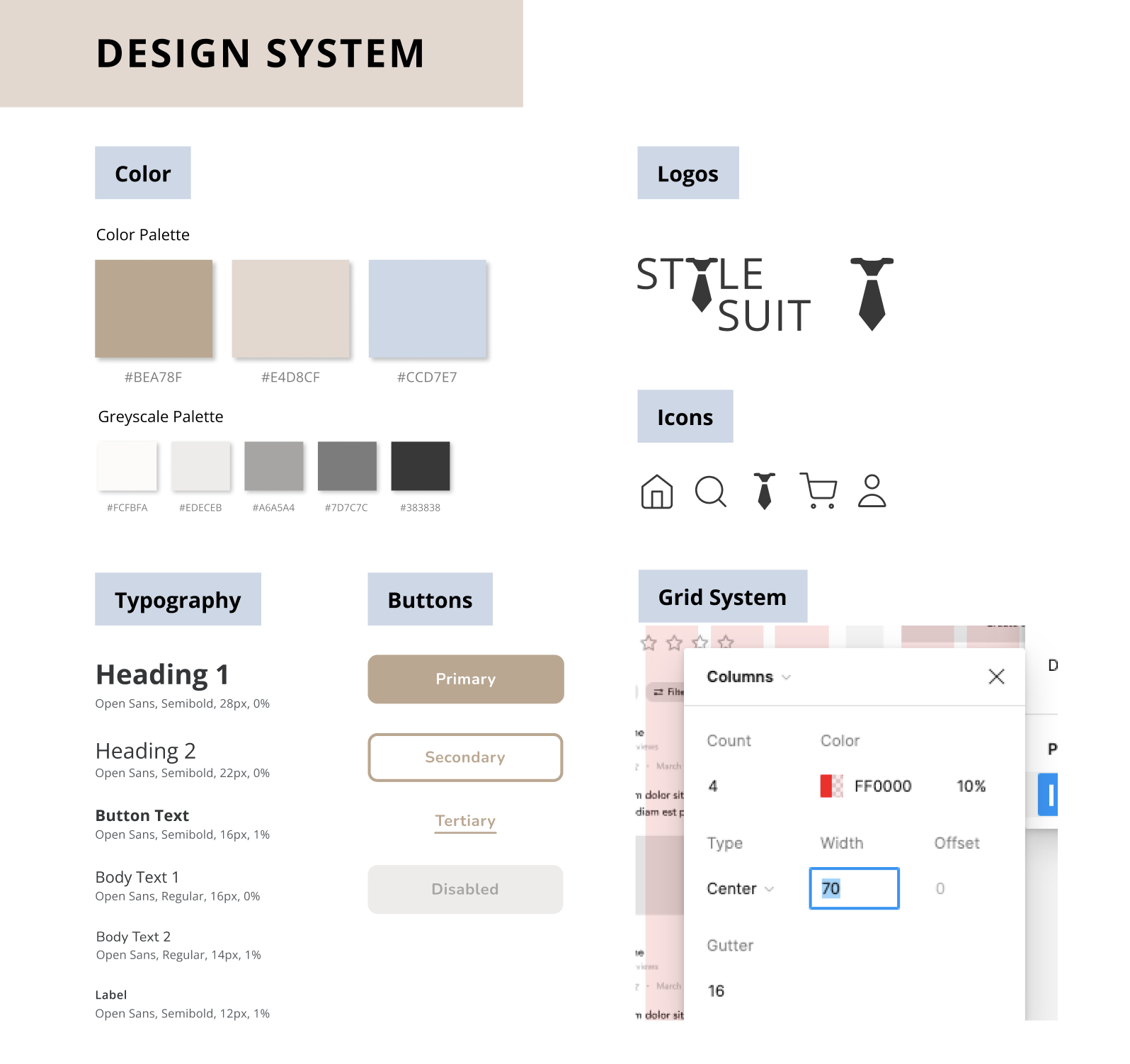 Once the low-fidelity wireframes were complete, we decided as a team to take a moment to focus on the visual identity of Style Suit. Here we spent time researching the psychology of color, curated a design system, and made inspiration boards. I was even able to design the logo for our product!